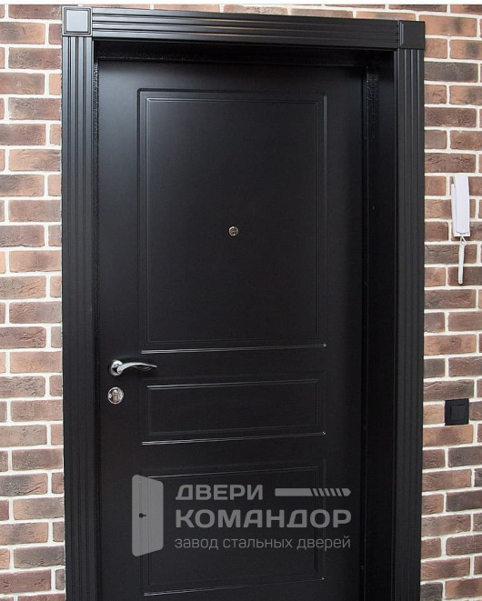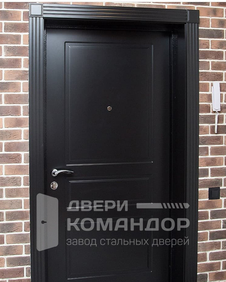 Входная дверь для квартиры: глубокий чёрный мат делает проём строгим и аккуратным, а ровные примыкания с готовыми откосами сразу закрывают монтажный шов — чисто и без лишних доработок. Порошковая текстура практична в подъезде: не боится частых касаний, ключей и ремней сумок, легко вытирается и не выгорает. Внутри та же спокойная матовая поверхность — нейтральная к любому интерьеру прихожей. По периметру — плотный прижим с уплотнением, он глушит шум лифта и запахи площадки. В центре композиции — уверенный минимализм черной входной квартирной двери с откосами: надёжная запирающая система, удобная ручка, аккуратный глазок и тихий ход полотна — всё по делу, без лишнего декора.