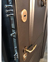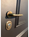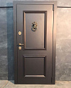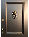 Статусная входная дверь для квартиры с обеих сторон оформлена крашеным МДФ: глубокие филёнки и аккуратный багет создают объем, матовая поверхность с легким металлизированным отливом не бликует и стойко переносит повседневные касания. В центре внимания — массивное кольцо-стукалка в форме льва: эффектный акцент, который сразу задает тон и избавляет от лишних нажатий в звонок. Фурнитура выдержана в едином теплом металле, верхний и нижний замки разнесены по уровням, что добавляет спокойствия и удобства в эксплуатации, глазок дает обзор на площадку. У двери с отделкой МДФ и молотком строгая геометрия рамок и ровные зазоры, поэтому она смотрится солидно и собрано, а однотонный темный цвет легко вписывается и в классический, и в современный интерьер прихожей.