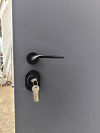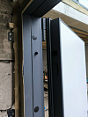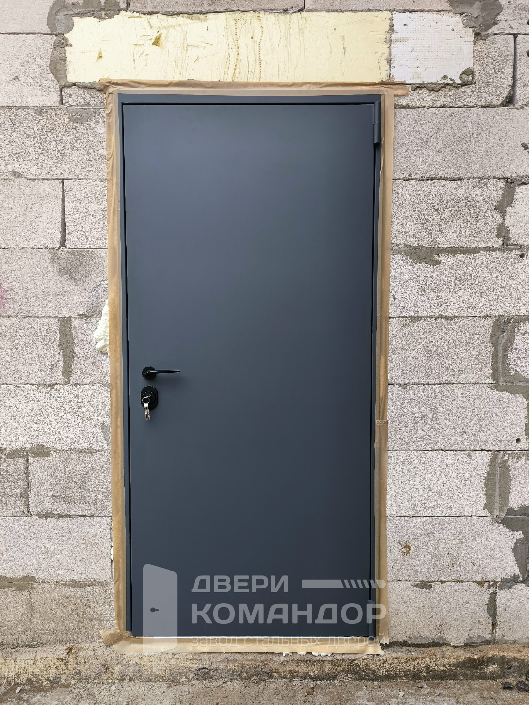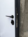 Снаружи дверь выглядит собранно: матовый графит без рисунка и вставок поддерживает современный фасад и не спорит с отделкой. Внутри — ровная белая плоскость, которая визуально облегчает входную зону и не требует подбирать интерьер под дверь.