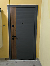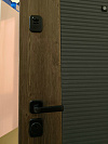 Металлическая входная дверь для квартиры или тёплого подъезда, которая сразу выбивается из ряда однотипных полотен. Снаружи — графитовая рифлёная панель с вертикальной вставкой под тёмный дуб, за счёт контраста дверь выглядит уже «готовым интерьерным решением» у самого порога и не боится случайных ударов и царапин. Внутри — спокойная белая МДФ с тем же рельефом: визуально расширяет прихожую, легко моется и не желтеет от искусственного освещения. Лаконичная чёрная фурнитура, сквадные накладки и мощная многоригельная система запирания добавляют ощущение монолитности, а уплотнители по периметру делают закрывание мягким и приглушают шумы из подъезда.