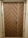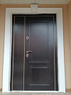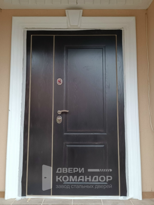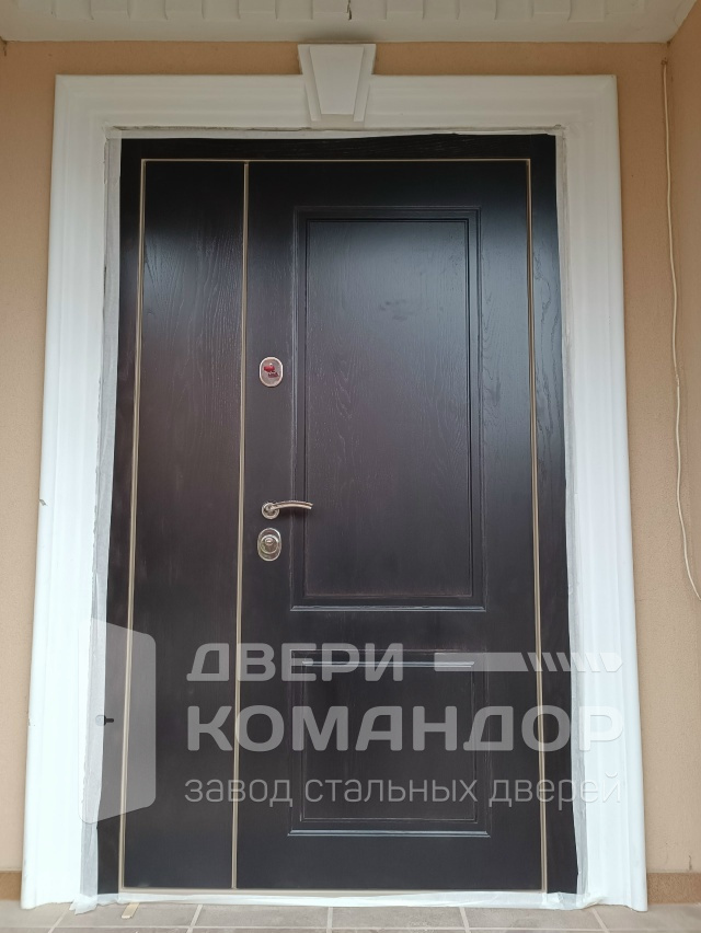 Полуторная входная дверь для частного дома, рассчитанная на улицу: основная створка работает каждый день, узкая створка подключается, когда нужно занести габаритные вещи — удобно и без лишних усилий. Снаружи — тёмная МДФ-панель с тонкими золотистыми кантом и строгой фрезеровкой: смотрится статусно и достойно соседствует с кирпичом и светлыми порталами. Внутри — тёплая «ёлочка» МДФ, которая не боится повседневных прикосновений, меньше подвержена царапинам и долго сохраняет рисунок. В конструкции использован терморазрыв: полотно и коробка не промерзают, конденсат и ледяные «подтеки» исключены. В полуторной двери Stardis Termo продуман каждый штрих — плотные контуры уплотнения, глазок на удобной высоте, аккуратная фурнитура — в итоге тишина в прихожей и уверенное ощущение защищённости без жертв в дизайне.