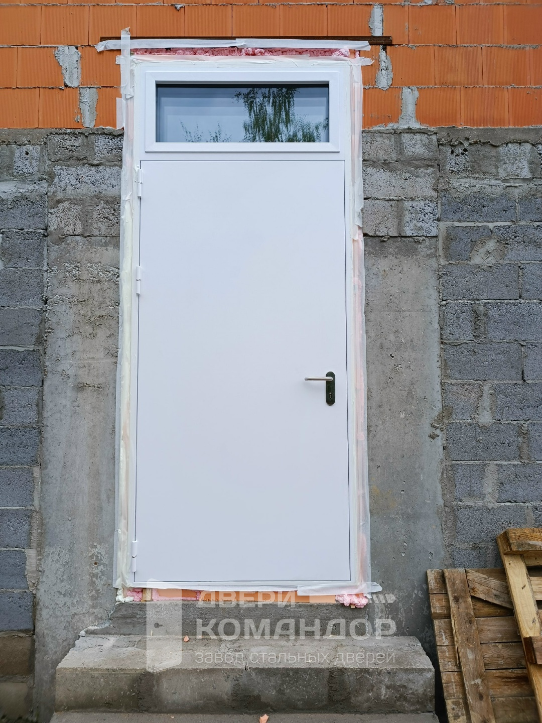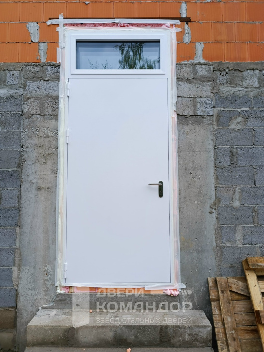 Надёжная противопожарная дверь для общественных и производственных объектов, где важен безопасный выход и порядок. Снаружи — аккуратный белый лист, внутри — горизонтальная штанга антипаника: нажал и вышел даже с занятыми руками. Верхняя фрамуга со стеклопакетом даёт свет в тамбур или коридор и визуально облегчает проём при высокой коробке. Порошковое термонапыление устойчиво к царапинам и климату, легко моется и долго сохраняет цвет. Магнитные уплотнители прилегают без щелей — меньше сквозняков, лучше звукоизоляция. Конструкция металл/металл, продуманная для частой эксплуатации; терморазрыв в полотне и коробе разрывает мост холода, поэтому дверь уместна на стыке улицы и тёплого помещения.