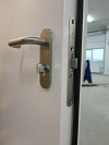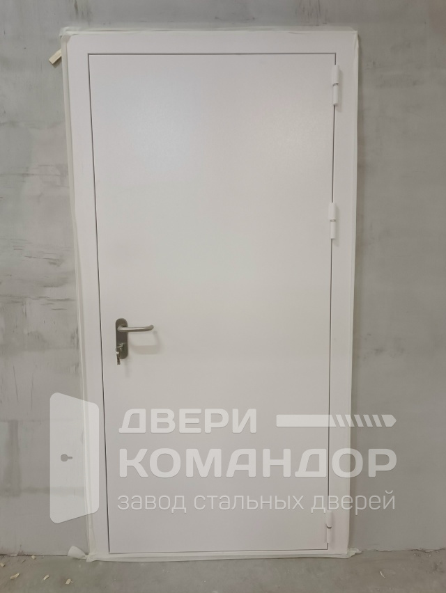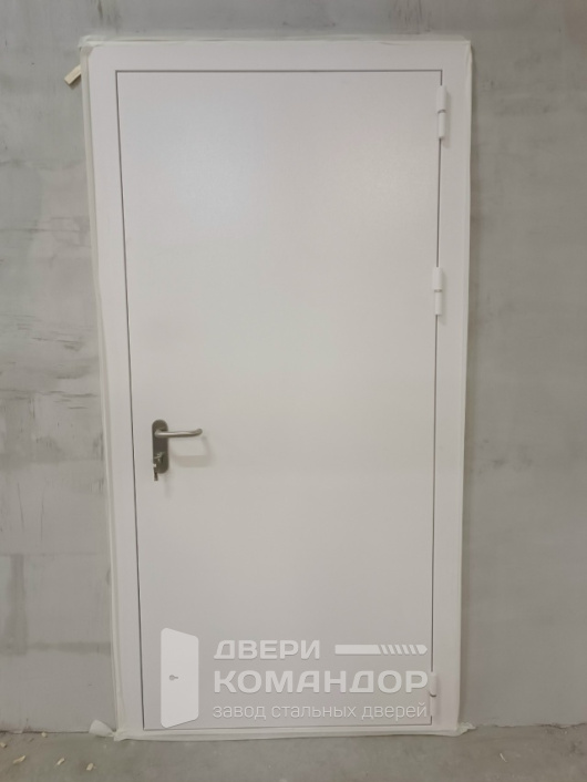 Белая противопожарная дверь для подъездов, офисных коридоров и технических помещений частного дома: строгая геометрия, порошковая эмаль с лёгкой шагренью и аккуратные радиусы кромок. На фото видно доводчик — створка закрывается плавно и не хлопает; по периметру идёт чёрный контур уплотнений и термолента, которые при нагреве перекрывают зазоры и не дают дыму пройти. Ручка на длинной накладке лежит в руке уверенно, защёлка с цилиндром работает чётко, внешняя фурнитура неброская, но износостойкая. Порошковое покрытие легко отмывается от следов, не боится частых касаний и устойчиво к мелким ударам. Остекления нет — гладкое полотно проще обслуживать и оно не отвлекает: именно то, что нужно, когда на первом месте безопасность и порядок.