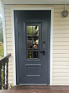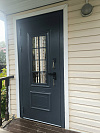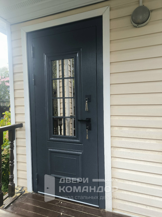 Снаружи — тёмный графит со структурной фактурой. Такая поверхность практична: на ней меньше заметны пыль, мелкие касания и следы от активной жизни у входа. Получается строгий вид для частного дома, который не требует ежедневной полировки настроения.