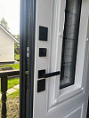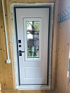 Вертикальное окно добавляет естественный свет в прихожую, не превращая входную группу в витрину. Формат узкий, поэтому дверь остаётся визуально цельной и собранной, а стекло работает как аккуратный источник дневного освещения.
