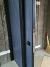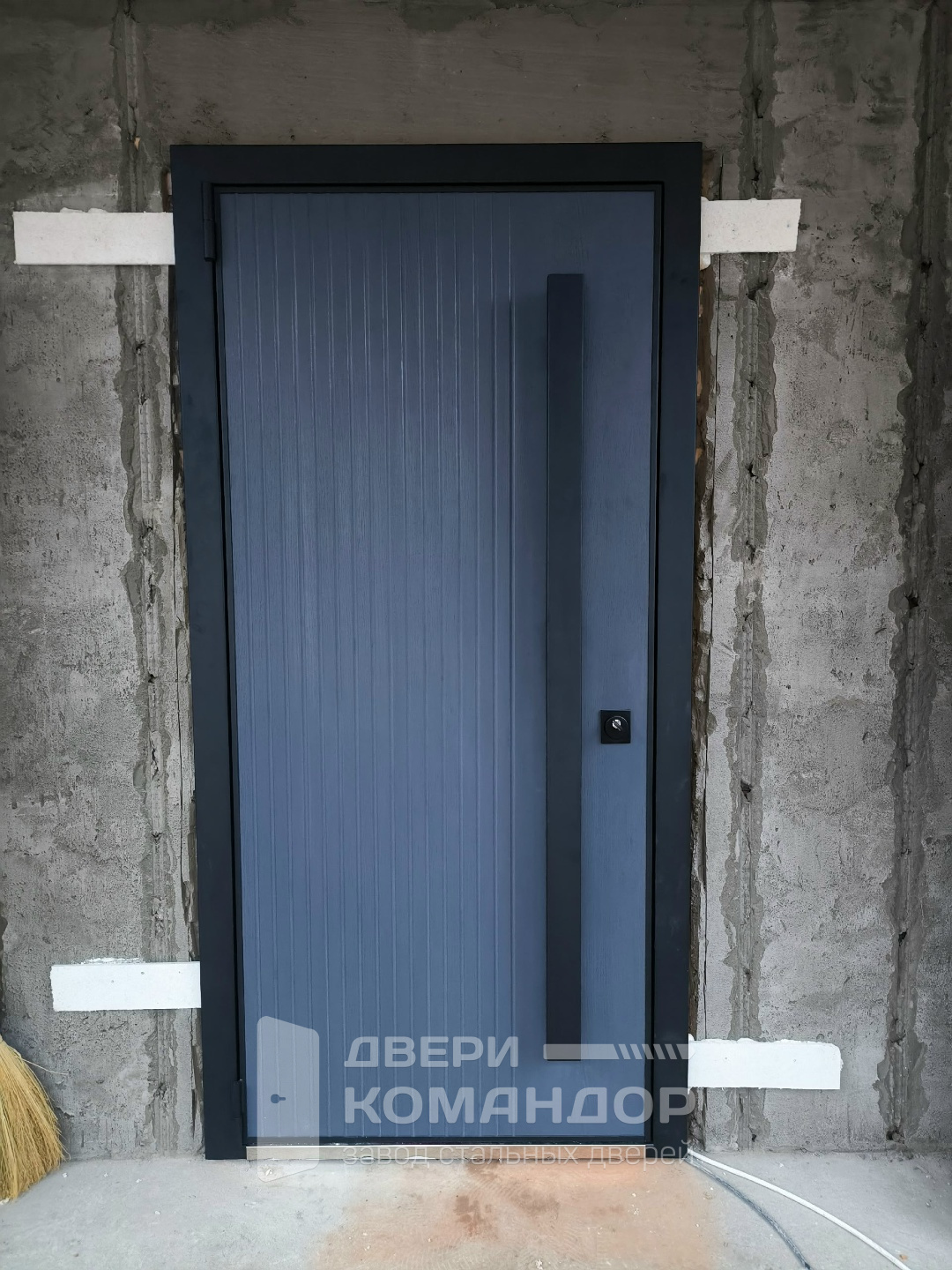 На фоне графита скоба выглядит как архитектурный штрих. Вход становится более статусным без стекла, ковки и прочих элементов, которые часто перегружают полотно и быстро надоедают.