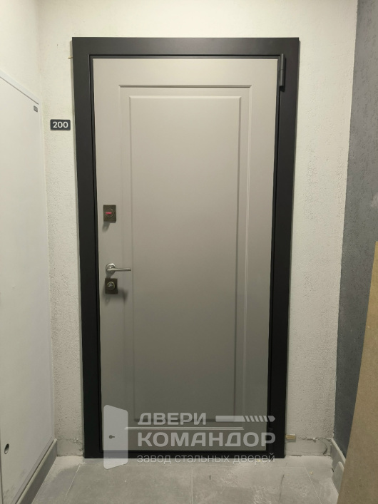 С внешней стороны — светло-серый матовый щит с выразительной филёнкой: геометрия читается сразу, но не превращает вход в музей лепнины. За счёт симметрии и рамочного рисунка дверь выглядит дороже, чем от неё ожидают в обычном подъезде.