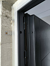 Вертикальная рифлёная вставка рядом с замками добавляет техничности и визуально вытягивает полотно. Это тот самый штрих, из-за которого дверь запоминают, даже если не планировали.