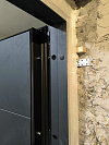 Фурнитура тоже в чёрном исполнении: ручка и накладки поддерживают общий стиль и не превращают вход в витрину из разных металлов. Плюс на полотне предусмотрен глазок, чтобы контролировать, кто там решил прийти без приглашения.