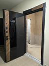 Контраст чёрного и дерева делает дверь заметной без крика. Чёрные плоскости дают строгость, древесная текстура добавляет домашнее тепло, а глянец добавляет глубину и ощущение дорогой отделки. Такой комплект легко подружить и с минимализмом, и с современным интерьером.