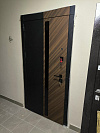 Эта дверь берёт не бронёй из декоративных завитков, а чистой геометрией: матовый чёрный фон, тёплая тёмная древесная фактура и аккуратная глянцевая вставка. В итоге получаете вход, который выглядит собранно и современно и в подъезде, и внутри квартиры.
