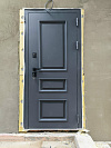 Внешняя сторона выполнена в графитовом матовом цвете с выраженной геометрией филёнок. Рельеф задаёт порядок: полотно не выглядит плоским листом, но и не превращается в выставку узоров.