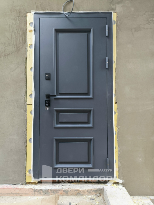 Такая геометрия работает на главный эффект — опрятный, строгий вход. Следы эксплуатации на матовой поверхности визуально менее заметны, а рамочный рисунок держит вид двери собранным даже в «шумном» подъезде.