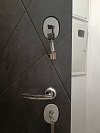 Эта дверь создана для квартиры: снаружи — практичный тёмный графит с диагональной фрезеровкой, который не собирает взглядом мелкие следы и царапины в подъезде, внутри — чистый супер-вайт с тем же геометричным рисунком, визуально расширяющий прихожую. Обе стороны — МДФ с износостойким покрытием: легко протереть, не выгорает и долго держит форму. Усиленная запорная зона с массивными круглымі ригелями и накладками под цилиндр и сувальду внушает спокойствие, а панорамный глазок помогает контролировать обстановку. Короб и наличники в «лунном камне» аккуратно обрамляют полотно и попадают в современную серо-графитовую гамму. Стильный, но деловой дизайн — когда нужно одновременно красивое и надёжное решение для повседневной жизни.