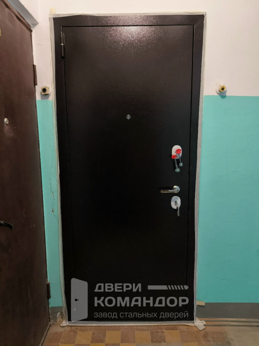 Эта входная дверь берёт не декором, а спокойным силуэтом: ровное полотно без накладок и лишних линий держит фасад собранным и не спорит ни с плиткой, ни с краской в подъезде.
