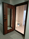 Эта дверь создана для квартиры в современном подъезде: снаружи вы видите строгую панель под итальянский орех с графичными диагональными линиями, которые аккуратно «ломают» плоскость полотна и не надоедают годами. Изнутри — большое зеркало почти во весь рост в тёплой деревянной раме: удобно поправить одежду перед выходом и визуально расширить узкий коридор. Металлическое полотно закрыто МДФ-накладками, устойчивыми к царапинам и бытовой влажности, их легко протереть, они не боятся частых уборок и искусственного освещения подъезда. Короб и торец полотна окрашены под коричневую «крокодиловую кожу» — фактура скрывает мелкие сколы и следы эксплуатации, при этом дверь выглядит аккуратно даже через несколько лет. Несколько контуров уплотнения глушат шумы и запахи, а чёрная матовая фурнитура, глазок и замковая группа поддерживают спокойный минималистичный стиль и чувство защищённости.