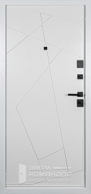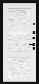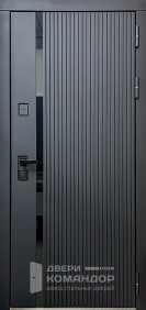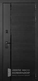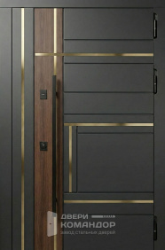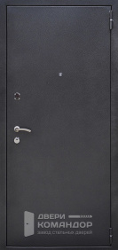 Дверь задумана так, чтобы с подъезда выглядеть строго и собранно, а в квартире — тёпло и по-домашнему. Снаружи матовый чёрный металлический щит не бликует и держит солидный вид даже при ярком освещении.