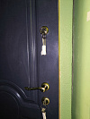 Фурнитура без сюрпризов: нажимная ручка, глазок и два замка в привычной логике. Ничего лишнего — только то, что поддерживает общий строгий образ.