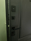 Все элементы держатся в одной вертикали: глазок, замки, ручка. Благодаря этому дверь остаётся строгой и не превращается в панель управления входом.