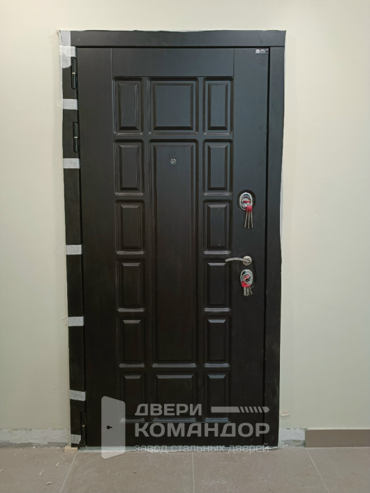 New York Лабиринт — аккуратная дверь для квартиры или отапливаемого тамбура. Снаружи — глубокий темный тон с рельефными прямоугольниками в духе неоклассики, рисунок ловит свет и делает полотно визуально дороже; внутри — светлая древесная поверхность с тем же геометрическим «лабиринтом», легко встраивается в современный интерьер. Обе стороны — МДФ: покрытие устойчиво к повседневным касаниям, мелким царапинам, не требовательно в уходе и долго держит цвет и фактуру. Два разнесённых замка с удобной изогнутой ручкой работают мягко, изнутри — поворотник для быстрого запирания. На петлевой стороне есть противосъёмные штыри, контуры уплотнения идут по периметру — дверь закрывается плотно и тихо. Короб и кромки собраны ровно, зазоры минимальны: вход выглядит строго и аккуратно уже с порога.