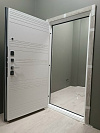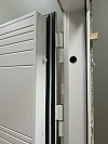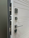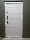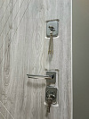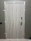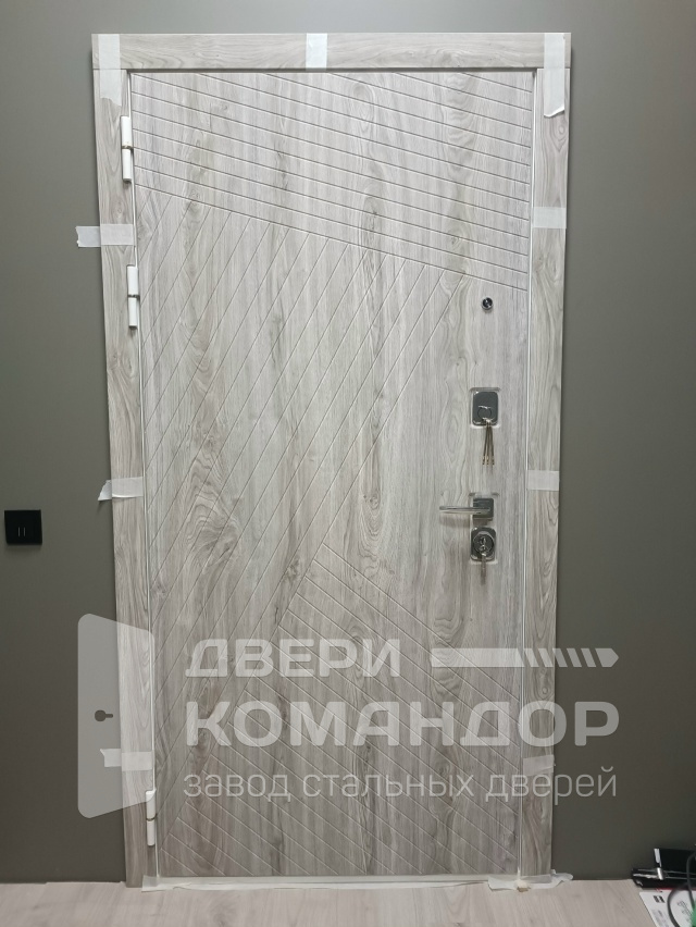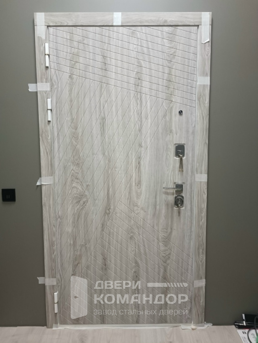 Эта дверь создана для квартиры или тёплого подъезда: снаружи — светлый древесный декор с выразительной диагональной фрезеровкой, которая ловит свет и визуально стройнит проём, внутри — чистая белая панель с аккуратными горизонтальными канавками для гармонии с современным интерьером. Обе стороны выполнены из МДФ: материал гасит звук, тёплый на ощупь, не боится частых касаний и легко очищается от следов рук. Квадратные накладки и прямая ручка в холодном металле добавляют строгости; два разнесённых замка и глазок отвечают за повседневную безопасность, по периметру — контуры уплотнения для мягкого, «плотного» хода. На петлевой стороне предусмотрен противосъёмный штырь — мелочь, которую обычно не заметишь, но она работает, когда это действительно важно.