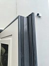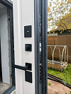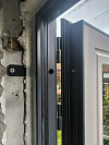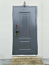 Снаружи дверь выглядит собранно и серьёзно: тёмный матовый фасад с рельефной металлической филёнкой не спорит с экстерьером и спокойно переживает уличную реальность. В итоге входная группа смотрится дороже и аккуратнее, а не как компромисс на скорую руку.