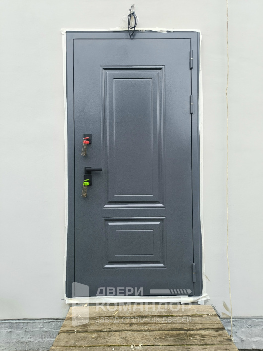 Металлическая внешняя панель практична: на матовой тёмной поверхности меньше заметны мелкие следы эксплуатации, а сам фасад воспринимается более устойчивым и собранным. Это важно для уличной двери, где внешний вид быстро проходит проверку погодой и руками.