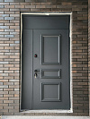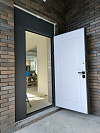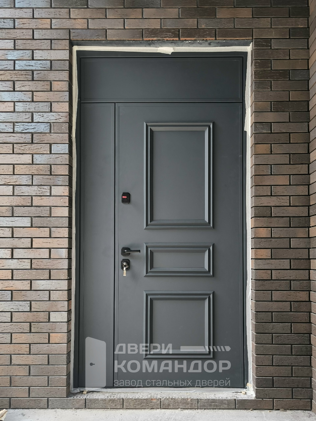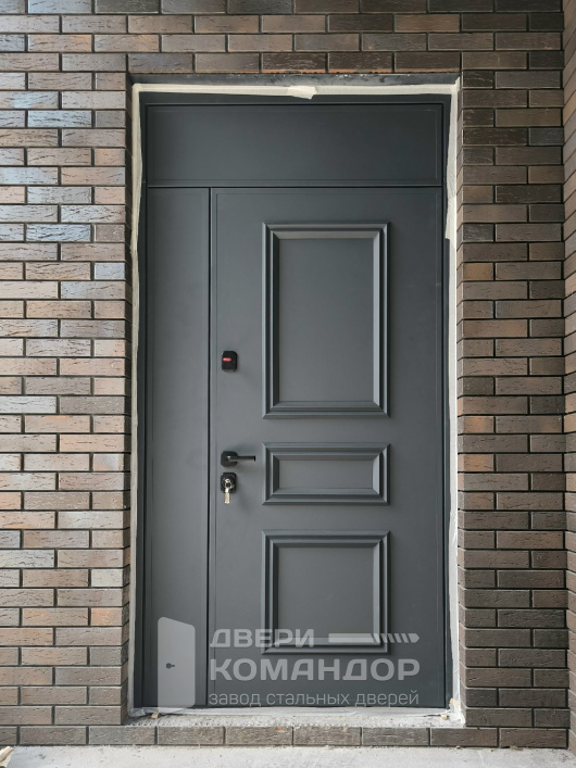 Эта дверь решает задачу большого проёма красиво и по делу: основное полотно работает как надёжная точка входа, а боковая и верхняя фрамуги собирают всё в аккуратный портал. В итоге вход выглядит цельно и статусно, без ощущения, что проём больше двери и его пришлось спасать компромиссами.