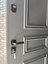 Ирония в том, что всё работает без спецэффектов: правильная геометрия, тёмный графит, выверенный рельеф. Дверь просто делает своё дело — держит тепло и выглядит так, будто проектировалась вместе с домом.