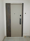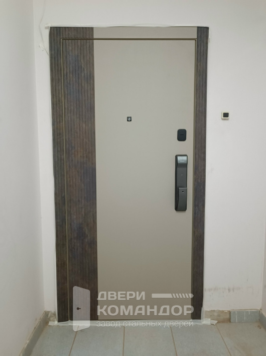 Чистая геометрия, тёплый оттенок полотна и выразительные ламели по периметру — эта дверь сразу собирает входную зону и аккуратно «подтягивает» проём. Решение с расширением проёма не только красиво, но и практично: ламельные доборы маскируют неровности стены и визуально расширяют проход. Биометрический замок Kaadas избавляет от лишних ключей: открылся по отпечатку или коду — и пошёл, при этом массивная планка-ручка удобна, когда руки заняты. Скрытые петли спрятаны в коробе, их сложнее поддеть, а открывание получается ровным и тихим. Снаружи и внутри — МДФ: стойкий к царапинам, не боится влажной уборки, помогает гасить звуки подъезда и дольше сохраняет цвет. Глазок держит контроль за площадкой. Оптимальное решение для квартиры или тамбура, когда нужен современный вид и комфорт каждый день.