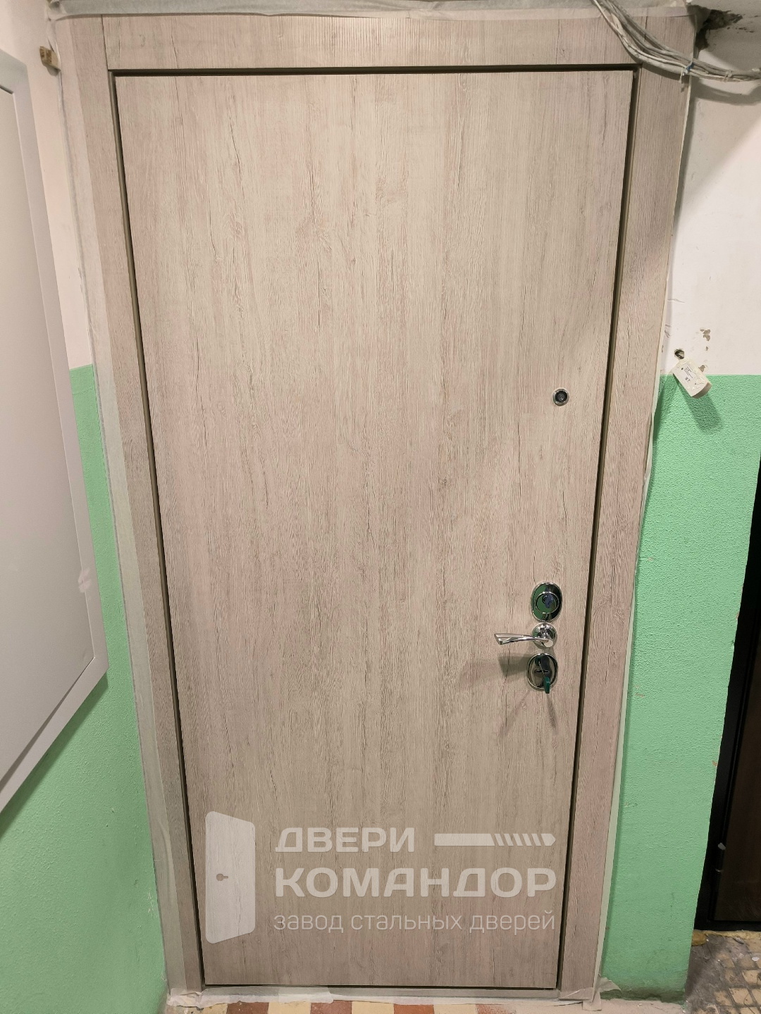 Спокойная отделка под светлый выбеленный дуб и аккуратная раскладка без лишнего декора делают эту дверь уместной для квартиры в подъезде: прихожая выглядит светлее, а ухаживать за панелями просто — МДФ тёплый на ощупь, не боится частых прикосновений и мелких царапин. Внутри — зеркало во всю высоту, которое визуально добавляет пространство и помогает собраться перед выходом. В стардис комфорте двухсистемный программируемый замок Kale с девиаторами фиксирует полотно в нескольких точках, давая плотный прижим; с петлевой стороны стоят противосъёмные штыри. Короб в тёплом песочном оттенке аккуратно обрамляет полотно, по контуру идёт уплотнитель. Есть глазок и возможность установить видеодомофон и оформить доборы в цвет.