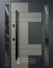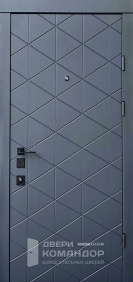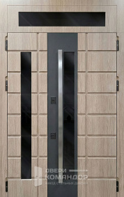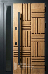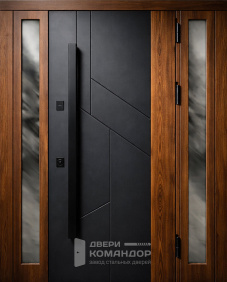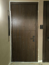 Снаружи — глубокий оттенок под тёмное дерево с живой древесной текстурой и тонкими горизонтальными размётками, внутри — спокойная матовая панель тёплого бежа; такая комбинация уместна для квартиры в подъезде: прихожая выглядит светлее, а коридор со стороны площадки — солиднее. Обе стороны — МДФ: тёплый на ощупь материал стойко переносит повседневные касания, не выгорает и легко очищается. В стардис комфорте двухсистемный программируемый Mottura с девиаторами запирает полотно в нескольких точках, а на петлевой стороне стоят противосъёмные ригели — дверь прижимается плотно и закрывается мягко. Есть глазок, предусмотрена установка видеодомофона и оформление доборов в общий тон. Лаконичная чёрная фурнитура подчёркивает геометрию, не споря с отделкой.