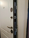 Дверь для квартиры в серии КОПЭ-87 с расширением проёма: аккуратный металлический портал перекрывает неровные стены и даёт чистую геометрию входа. Снаружи — молотковое покрытие темной бронзы: практичное, не боится мелких ударов и царапин, долго сохраняет цвет. Внутри — белая МДФ-панель с спокойной классической фрезеровкой, легко сочетается с любым ремонтом и не требует сложного ухода. По периметру — эластичный контур уплотнения для тишины на площадке и мягкого закрывания. Два замка Kale с мощными цилиндрическими ригелями и ночной задвижкой, а со стороны петель — противосъёмный штырь. Глазок, ровная посадка полотна и строгое сочетание фактур создают ощущение надежности без лишней демонстративности.