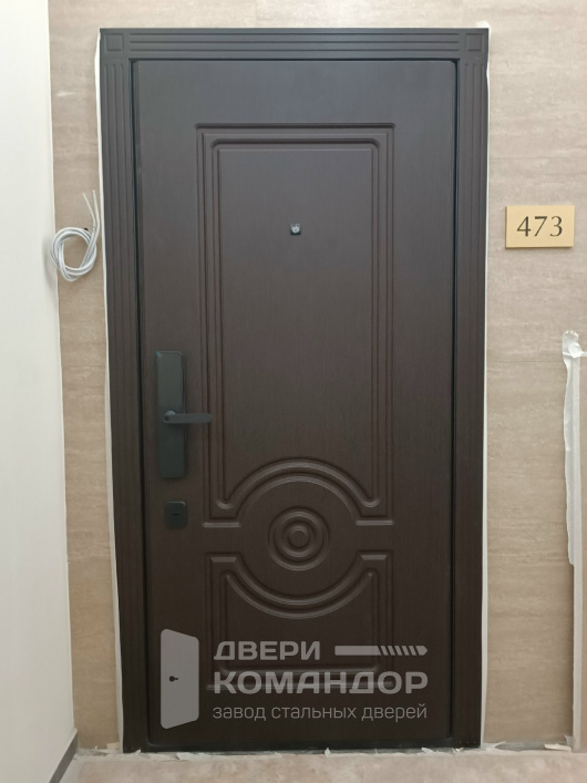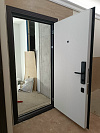 Эта дверь создана для квартиры: снаружи — благородная темно-шоколадная панель с глубокой фрезеровкой и классическим «медальоном», которая сразу добавляет статусности площадке, внутри — спокойная белая плоскость с тонким кантом для светлого, минималистичного интерьера. Обе стороны выполнены из МДФ: покрытие не боится ежедневных прикосновений, легко протирается, не выгорает в подъезде и долго сохраняет фактуру. Биометрический замок с удобным считывателем отпечатка и лаконичной ручкой избавляет от связки ключей и позволяет быстро попасть домой, а изнутри — повернуть фиксатор одним движением. Черная матовая фурнитура подчеркивает контраст и современный характер, аккуратный глазок держит ситуацию под контролем. Усиленные петли и плотные контуры прилегания отвечают за тишину и уверенное закрывание, короб формирует аккуратную рамку без лишних линий.
