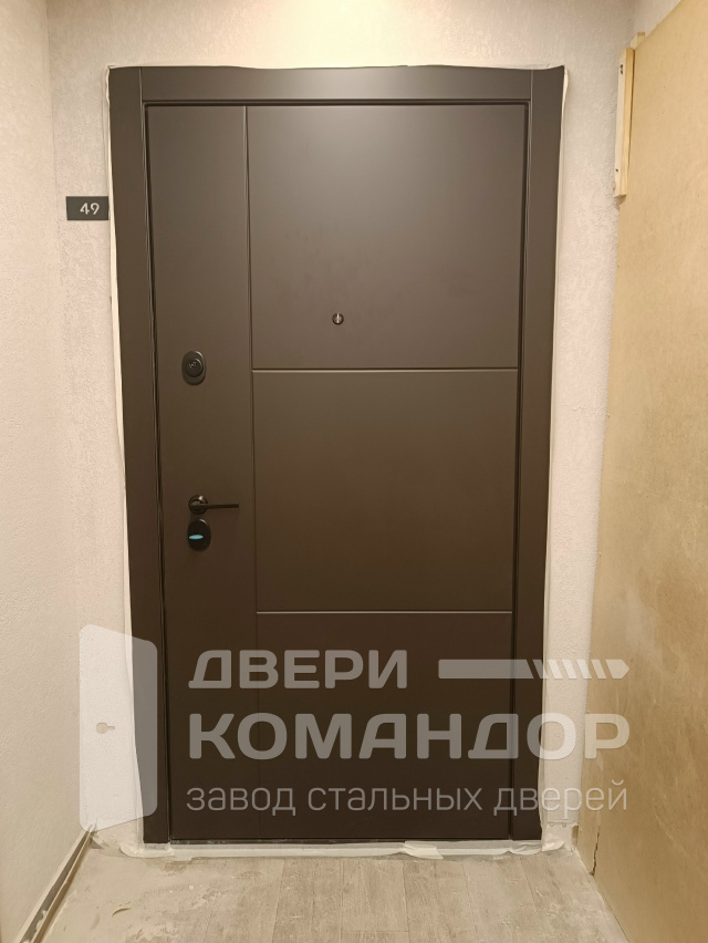 Stardis Expert с замками Mottura — спокойная и надёжная дверь для квартиры. Снаружи — тёмная МДФ-панель с лаконичными горизонтальными разделителями и узкой боковой вставкой, выглядит строго и не маркируется; внутри — ровная белая панель, визуально добавляющая света и места в прихожей. Комплект замков Mottura работает мягко и точно: верхний — под поворотник, нижний защищён броненакладкой; многоточечное запирание уводит ригели по периметру. Плотный притвор с уплотнителями гасит шум из подъезда и сквозняки, глазок даёт контроль на площадке. Чёрная матовая фурнитура подчёркивает геометрию полотна — современно, без лишнего блеска и компромиссов в повседневном пользовании.