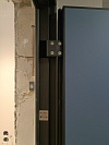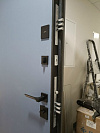 Это входная дверь для квартиры, которая играет фактурой и светом: снаружи — графитовая панель МДФ с вертикальным рельефом и узкой чёрной вставкой-молдингом, создающей стройный, «вытянутый» силуэт проёма. Поверхность практична: следы касаний не заметны, мелкие царапины не бросаются в глаза, ухаживать просто. Изнутри — спокойная гладкая плита МДФ в холодном серо-голубом тоне: не спорит с отделкой прихожей и визуально добавляет воздуха. Механика радует не меньше дизайна: многоточечное запирание с выдвижными ригелями, внутренняя задвижка для быстрого блокирования, усиленные петли и плотный контур уплотнения — дверь закрывается мягко и глушит звуки с площадки. Итог — аккуратный современный вход без лишнего декора, где стиль и удобство идут в одной связке.