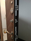 Рациональная дверь для квартиры: снаружи — стойкое молотковое покрытие, которое не боится ударов тележек и ключей соседей, внутри — тёплая МДФ-панель под орех с крупным вертикальным зеркалом. В узком коридоре оно работает как световой канал и мгновенно «расширяет» прихожую, а аккуратная фрезеровка добавляет графики без лишнего блеска. Два разнесённых замка с многоточечным запиранием, глазок, плотный прижим и контуры уплотнения отвечают за тихое закрывание и уверенную защиту. Конструкция рассчитана на эксплуатацию в подъезде: металл снаружи сохраняет вид при активной эксплуатации, МДФ внутри приятен на ощупь и легко моется. Продуманная, сдержанная, для тех, кто ценит практичный дизайн без компромиссов.