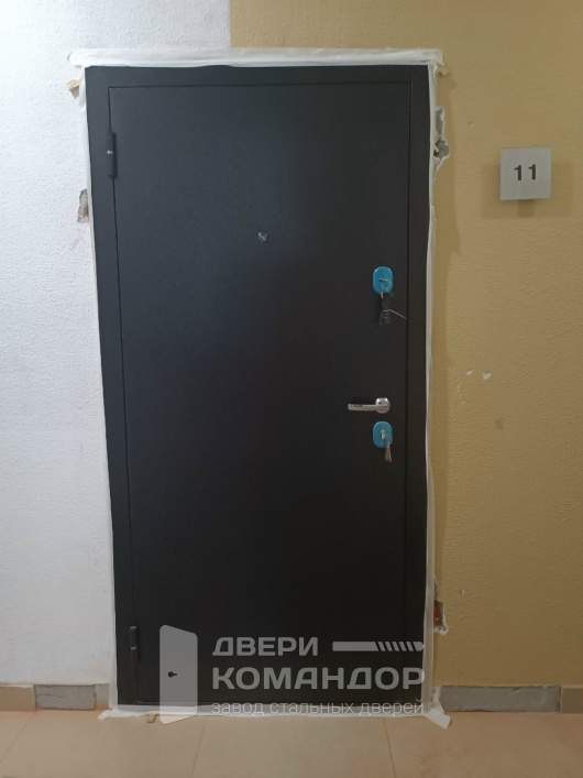 Входная дверь для квартиры с характером: снаружи — тёмное порошковое покрытие с молотковой фактурой, которое не бликует, маскирует мелкие следы касаний и спокойно переносит влажную уборку подъезда; внутри — МДФ в оттенке бежевого клёна с аккуратной фрезеровкой, освежающей узкий коридор и подружится и с светлой, и с контрастной отделкой. Полотно сидит ровно, плотный притвор и контур уплотнения приглушают шумы с лестничной площадки и не дают сквознякам гулять по дому. Разнесённые замки управляют стальными ригелями по кромке, глазок на удобной высоте — видно, кто пришёл. Хромированная фурнитура добавляет спокойного блеска, а усиленные петли работают мягко, без люфтов. Практично, строго и по-домашнему тёпло внутри.