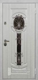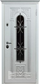 Уличная термодверь для частного дома: снаружи — графитовая МДФ-панель с глубокими филёнками и узким вертикальным стеклопакетом, прикрытым кованой решёткой в духе ар-деко. Свет проходит в прихожую, а приватность остаётся внутри. Внутри — белая МДФ с той же аккуратной геометрией: освежает интерьер и визуально расширяет коридор. Теплоизоляционный разрыв в коробке и полотне отсекует холод и конденсат, контуры уплотнения дают мягкое закрывание и меньше уличного шума. Два разнесённых замка и массивные выдвижные ригели на торце выглядят серьёзно и работают без лишних усилий, петли уверенно держат вес створки. Практичные поверхности легко моются и стойко переносят каждодневную эксплуатацию.