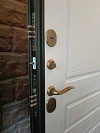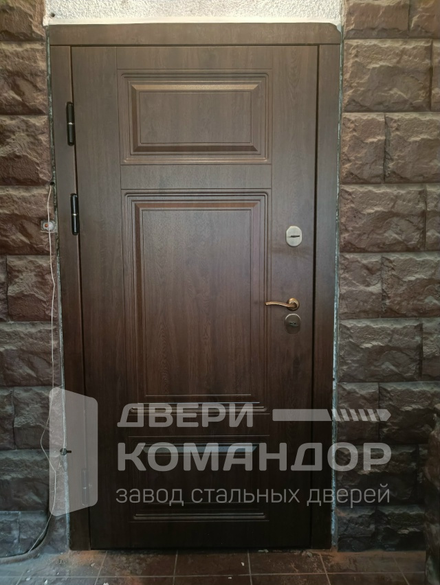 «Термо Сибирь Премиум Правила Входа» — уличная дверь для частного дома, созданная выдерживать холод и перепады влажности без мостиков холода. Снаружи — плотная МДФ-панель под тёмное дерево с классическими филёнками; фактура скрывает случайные царапины и не выгорает, сохраняя благородный оттенок на фасаде. Внутри — аккуратная белая МДФ с тем же рисунком, чтобы холл выглядел светлее и чище. Между стальным полотном и тёплой внутренней зоной — терморазрыв: короб и полотно разделены термовставкой, поэтому не потеет и не промерзает. Усиленные петли на опорных чашках, противосъёмные штыри со стороны навесов, два независимых замковых узла и удобная внутренняя задвижка добавляют спокойствия. По периметру — несколько контуров уплотнения для тишины и защиты от сквозняков. В итоге — солидный внешний вид снаружи и чистая геометрия внутри, без компромиссов с теплом и безопасностью.