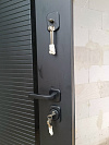 Тёплая входная дверь для частного дома: снаружи строгая эмаль на влагостойкой МДФ с горизонтальным рифлением — практичная поверхность не боится повседневных касаний, легко очищается и визуально скрывает мелкие следы погоды. Внутри — полноформатное зеркало в тонкой матовой раме: удобно собрать образ перед выходом и визуально расширить прихожую. Конструкция с терморазрывом разрывает холодный контур, снижая риск промерзания и конденсата, а плотные контуры уплотнения и многоточечное запирание дают мягкое, тихое закрывание и уверенную фиксацию. Лаконичная черная фурнитура поддерживает архитектурный стиль фасада и не спорит с интерьером.