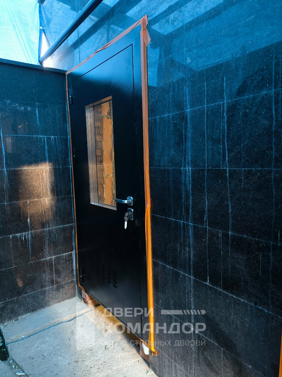 Дверь хорошо подходит для входных и технических зон частного дома, где важны и свет, и вентиляция. Строгий внешний вид не спорит с фасадом, а функциональные элементы выглядят как часть дизайна, а не как заплатка.