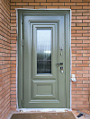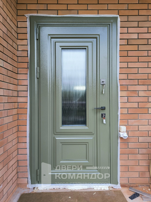 Эта дверь сразу выглядит собранно: фактурный металл в спокойном оливковом оттенке, аккуратные ступенчатые рамки и чёткая геометрия без лишних украшений. Получается современная классика, которая не спорит с фасадом и не устаревает через сезон.