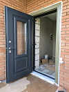 Высокий стеклопакет даёт дневной свет в прихожую и тамбур, но не превращает вход в прозрачную витрину. Рифлёное стекло размывает силуэты и детали, сохраняя ощущение закрытого пространства.