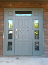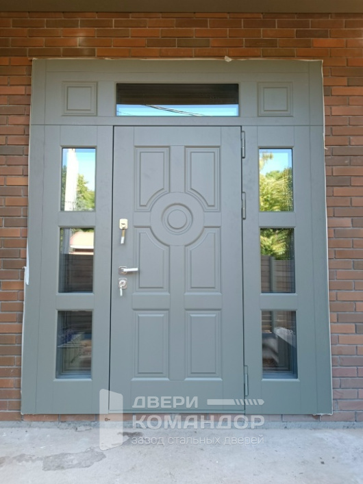 Этот входной портал для частного дома сразу даёт свет и статус: по обе стороны полотна — узкие остеклённые вставки с тройным ритмом, сверху — горизонтальная фрамуга. Глухое полотно с фигурной фрезеровкой и центральным медальоном выглядит солидно, при этом стеклопакеты в фрамугах оставляют прихожую яркой днём. Внутри и снаружи — МДФ-накладки, устойчивые к истиранию и случайным царапинам, их легко мыть, они не выгорают. В версии входной двери терморазрыв шпон / шпон с боковыми и верхней фрамугами со стеклопакетами на заказ тепло не уходит через металл: терморазрыв отсоединяет улицу от дома, уменьшая конденсат. Два разнесённых замка с мощными ригелями, противосъёмный штырь и три петли дают спокойный, плавный ход и надёжное запирание каждый день.