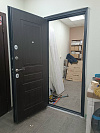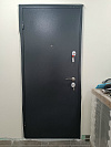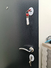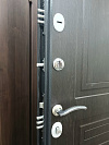 Надёжная входная дверь для квартиры: снаружи — строгий графитовый металл с молотковой фактурой, которая стойко переносит повседневные касания, мелкие царапины и не боится уборки подъезда; внутри — тёмная МДФ-панель с аккуратной фрезеровкой, создающей спокойный, «домашний» вид. Геометрия полотна ровная, глазок на удобной высоте, ручка лежит в ладони без скольжения. Усиленная система запирания с двумя разнесёнными замками и несколькими стальными ригелями фиксирует полотно по кромке, а противосъёмные штыри на стороне петель препятствуют взлому при попытке срезать петли. Короб и полотно плотно стыкуются — меньше сквозняков и посторонних звуков из подъезда. Практичное сочетание: уличная стойкость снаружи и тёплый интерьер внутри.