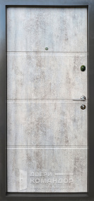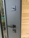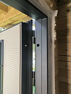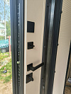Снаружи — матовый графитовый металл с ровной фактурой, рассчитанный на улицу: выглядит строго и не требует постоянных церемоний с уходом. Такой оттенок хорошо дружит и с фасадом, и с кровлей, и с тёмной фурнитурой, поэтому дверь не спорит с архитектурой, а собирает вход в единый образ.