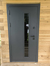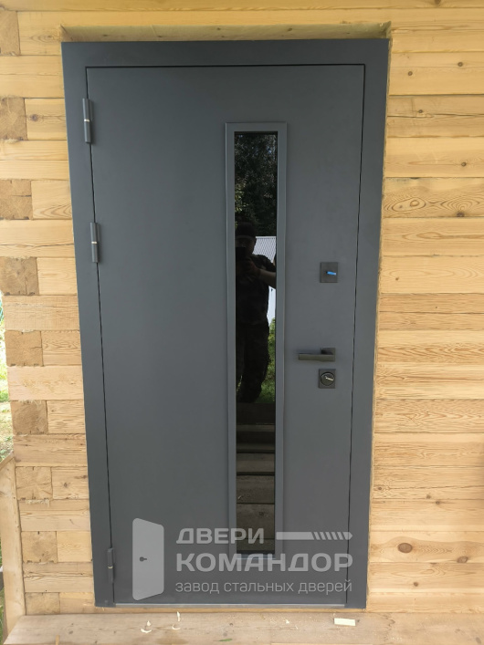 Эта дверь решает типичную дилемму частного дома: хочется тепла, но не хочется жить в прихожей как в бункере. Узкое вертикальное окно со стеклопакетом добавляет естественный свет днём, а за счёт вытянутого формата и тонировки не превращает входную группу в витрину.