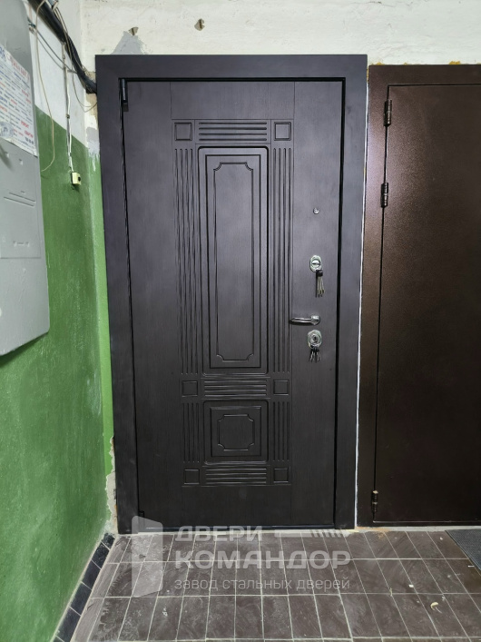 Снаружи полотно в цвете венге выглядит собранно и взросло: тёмная древесная фактура и фрезерованная филёнка дают аккуратную неоклассику без лишних украшательств. Это тот случай, когда входная дверь не спорит с интерьером подъезда и при этом сразу задаёт тон квартире.