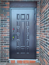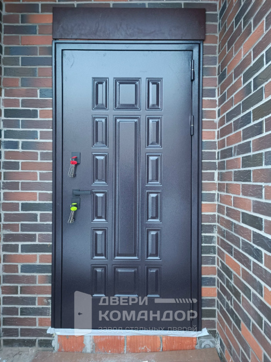 «Панцирь Термо» — спокойная классика, созданная для частного дома и уличной установки. Снаружи — темный, почти графитовый кессонный рисунок на прочной панели: выглядит солидно и не боится повседневных следов эксплуатации. Внутри — светлая МДФ-накладка с аккуратной фрезеровкой: чисто, современно, легко поддерживать порядок. Терморазрыв в конструкции разрывает мостики холода, поэтому ручка и откосы зимой не «плачут», а прихожая остается теплой. Двусторонняя стилистика решает сразу две задачи: фасаду — строгий характер, интерьеру — свет и визуальная легкость. Фурнитура в темном матовом исполнении на контрасте смотрится собранно и подчеркивает геометрию полотна. Надежное запирание и плотный контур уплотнения добавляют ощущение тишины и контроля каждый раз, когда дверь закрывается за вами.
